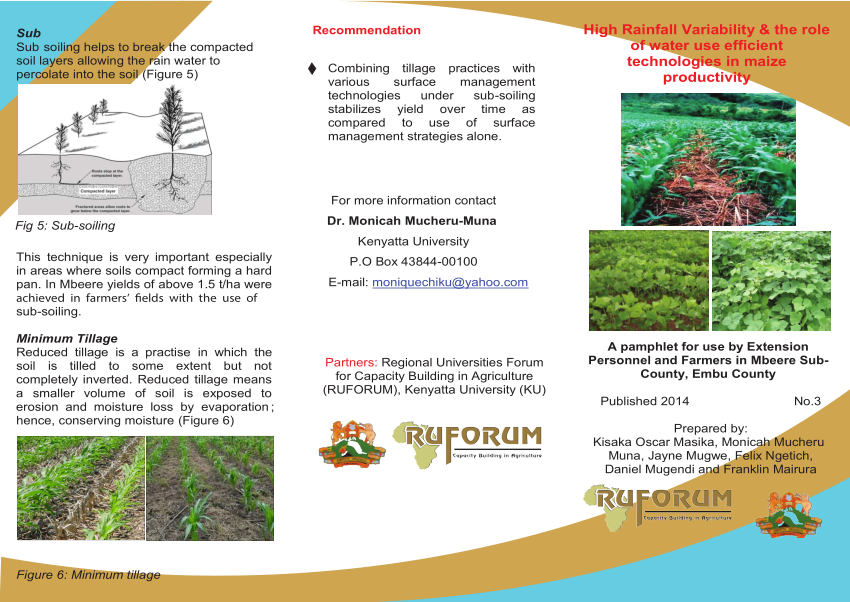 tillage practices with various surface management technologies under sub-soiling stabilizes yield over time as compared to use of surface management strategies alone. Partners: Regional Universities Forum for Capacity Building in Agriculture (RUFORUM), Kenyatta University (KU) -is This pamphlet funded by RUFORUM -soiling -; Recommendation Sub Sub soiling helps to break the compacted soil layers allowing the rain water to percolate into the soil (Figure 5) This technique is very important especially in areas where soils compact forming a hard pan. In Mbeere yields of above 1.5 t/ha were achieved in farmers' elds with the use of sub-soiling. Minimum Tillage Reduced tillage is a practise in which the soil is tilled to some extent but not completely inverted. Reduced tillage means a smaller volume of soil is exposed to erosion and moisture loss by evaporation hence, conserving moisture (Figure 6) Figure 6: Minimum tillage Fig 5: Sub-soiling